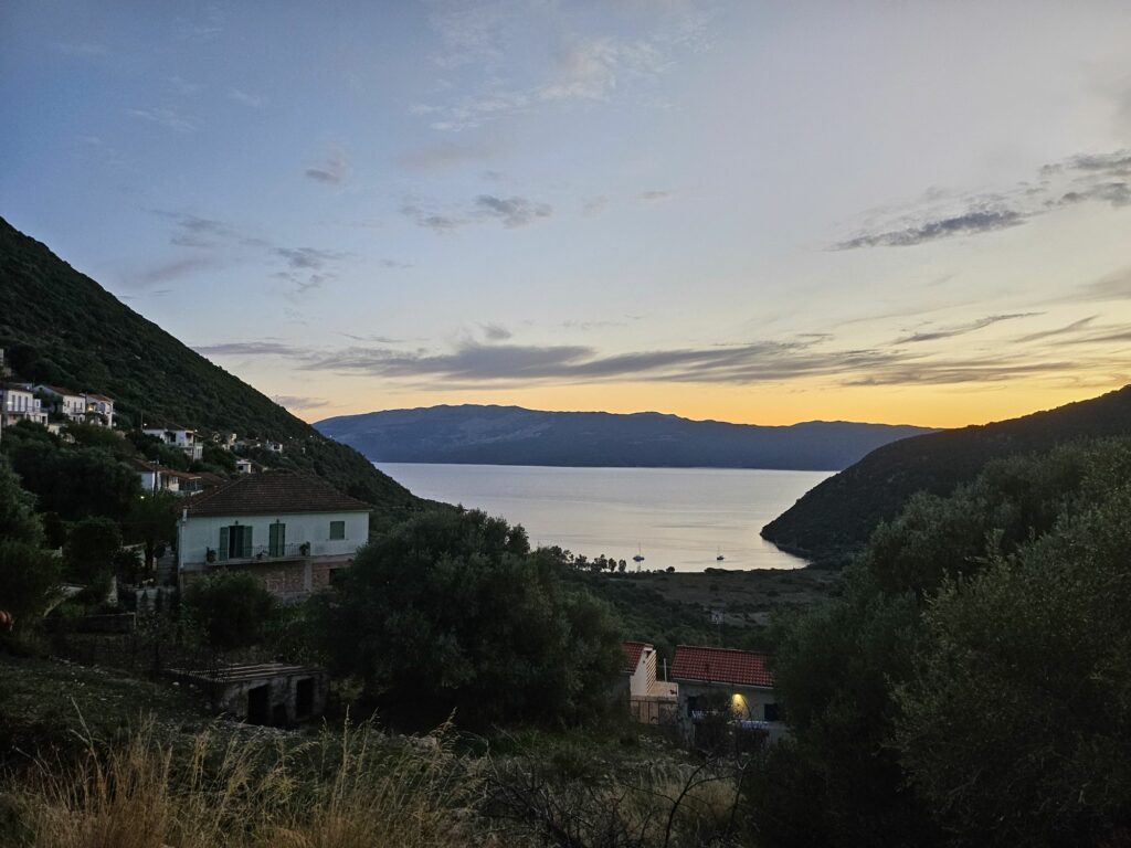 Dinner is to be found 2km up the hill in the  town of Stavros, from which you can look down to the other side of island, you can see a couple of yachts at anchor.