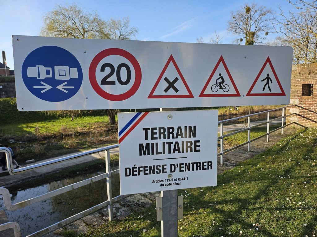 We walked to the Citadel https://en.m.wikipedia.org/wiki/Citadel_of_Lille which seems to be both an active military base, and an ancient monument. This leads to load of tourists wandering casually past these signs.