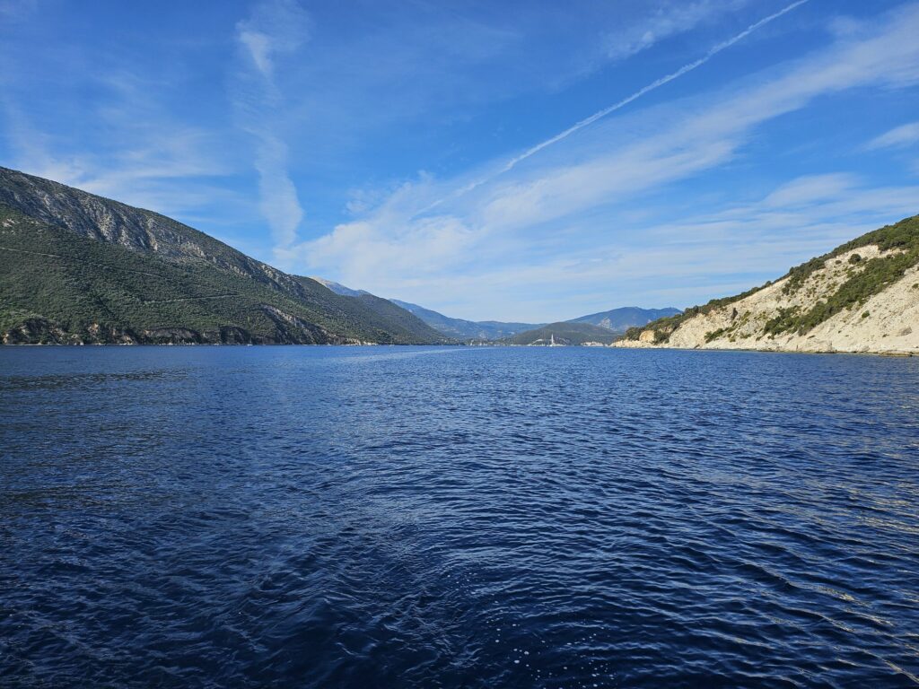 We sailed until the wind died at about 1pm and then motored for a bit until we entered the meganisi channel which funnels the wind and makes it much stronger. This channel featured in a blog post from a few years ago but going in the other direction in rather more breeze..