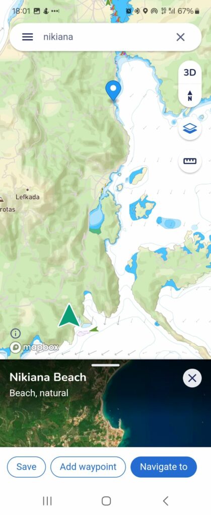 Today’s objective was to sail from our start point at Nikiana (shown in Blue) to one of the many places in Greece called Sivota. The particular one in this case being shown in Green. Its about 11nm and the forecast was for light winds. There was some breeze at 9AM so we headed out as soon as we could.
