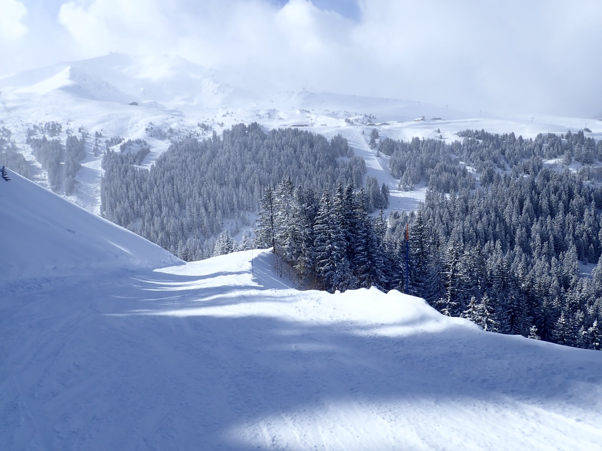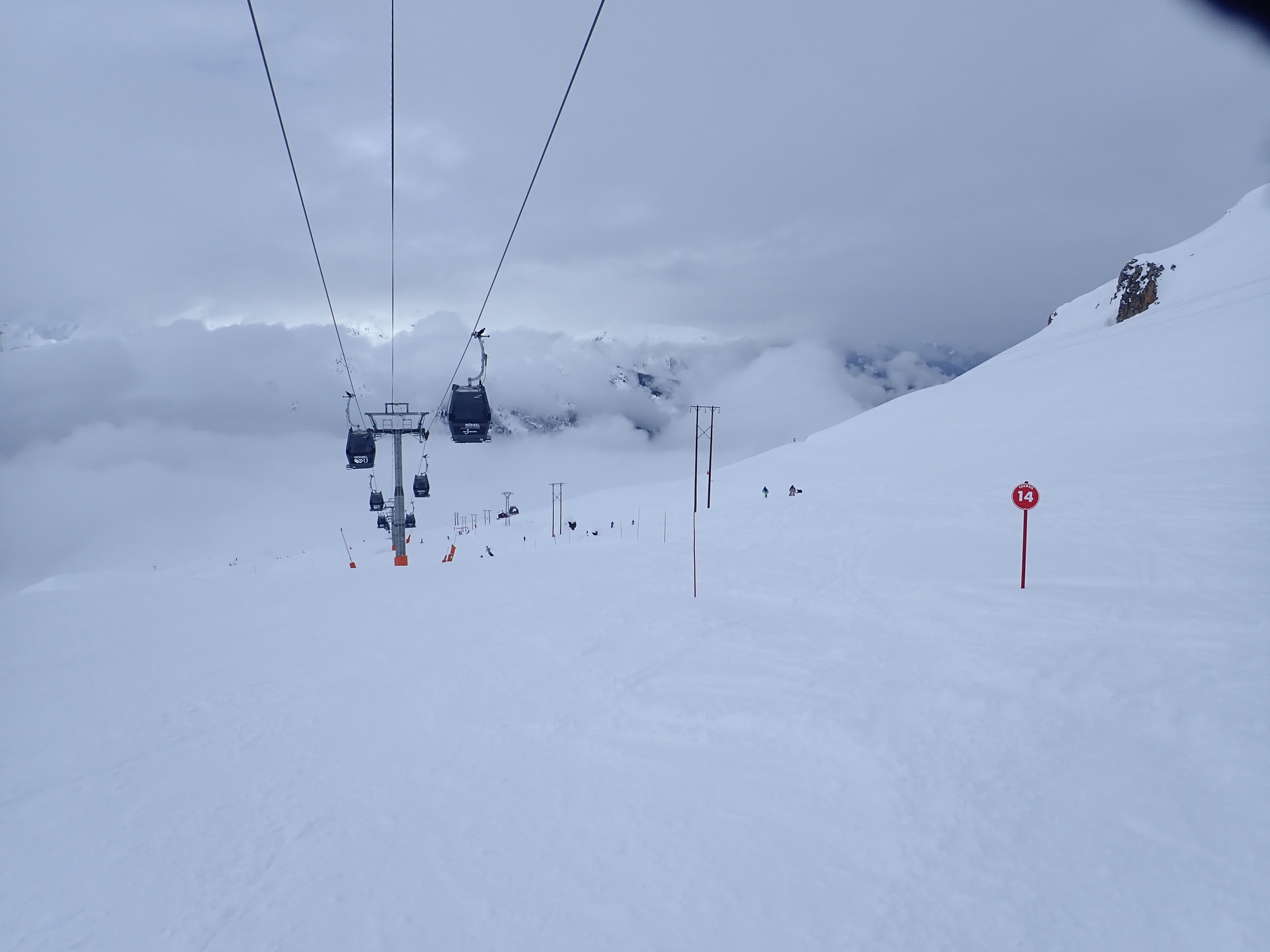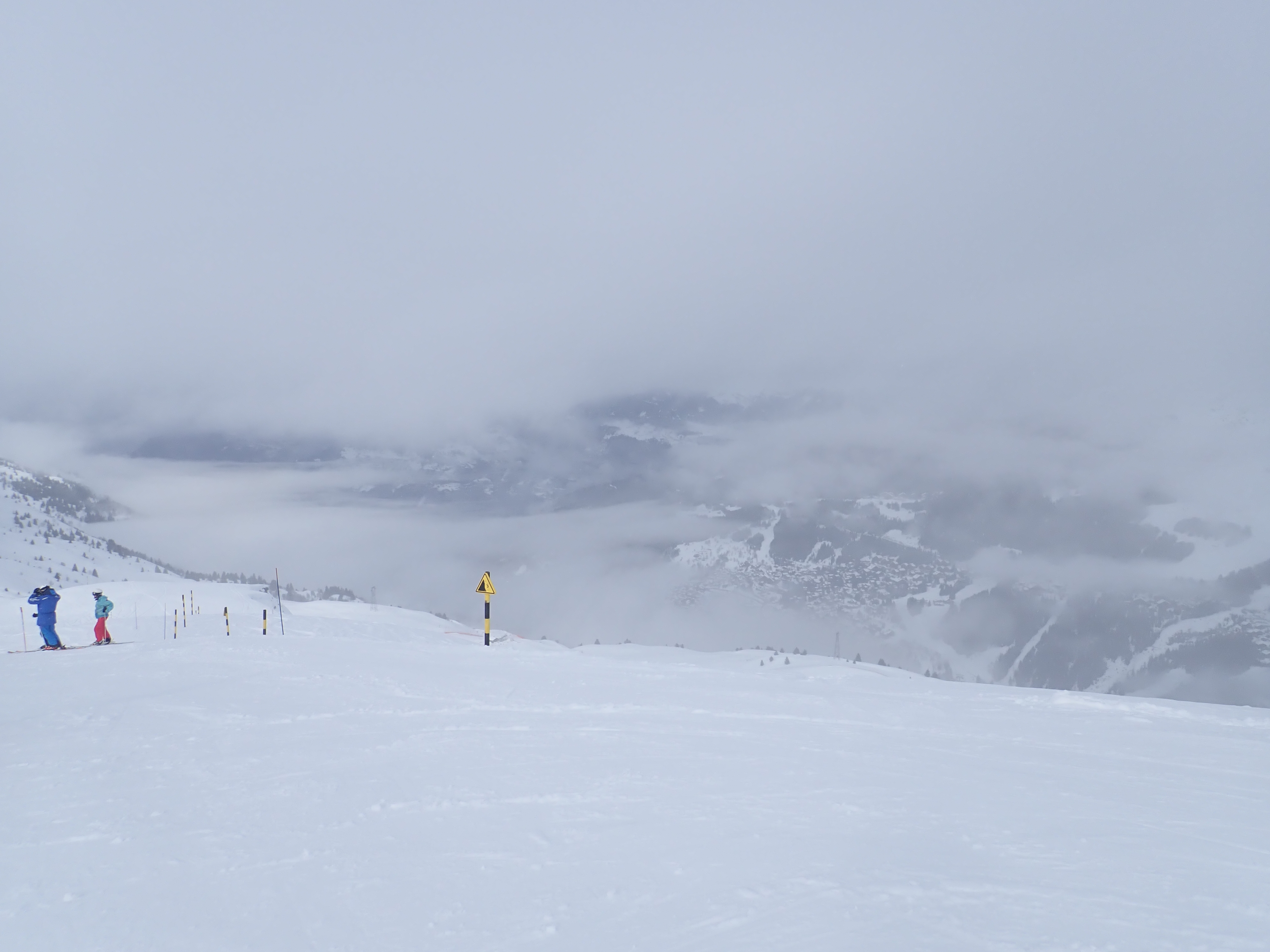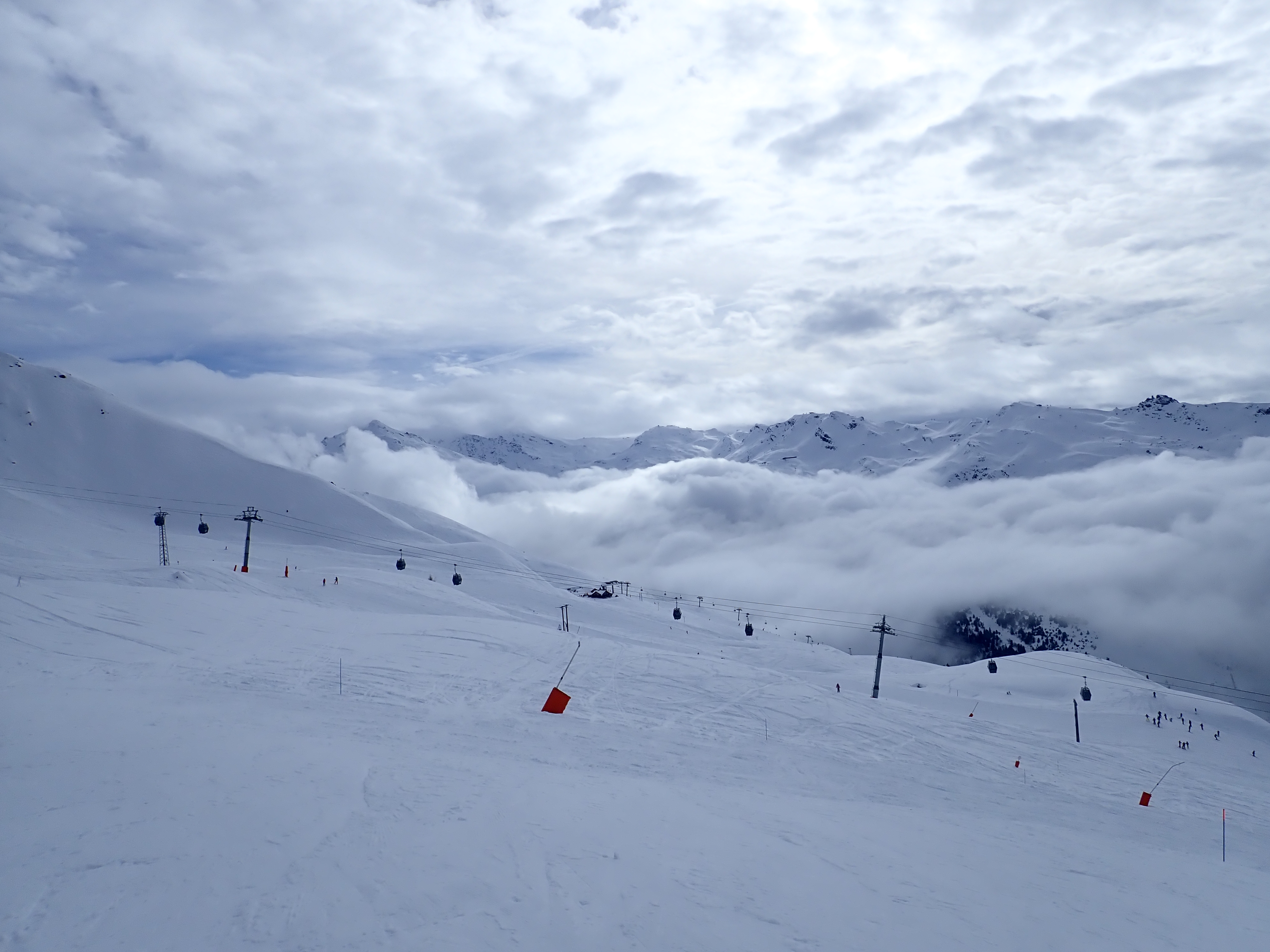The weather got truly horrid in the afternoon, I guess this is a risk with a resort so high but you literally could not see from one piste marker to the next, you just guess and hope another pole of the correct colour appears. We could hear the distant sound of this cafe long before we could see it. We waited for a relatively clear spell with some coffee before heading down, deciding that there was no need to reduce the cost per crash further, and an early stop would be wise as the forecast for the next two days is good. Of course, the sun comes out the instant we reach the apartment, but there were still plenty of clouds so we stuck to the plan and sat on the balcony with a cup of coffee.