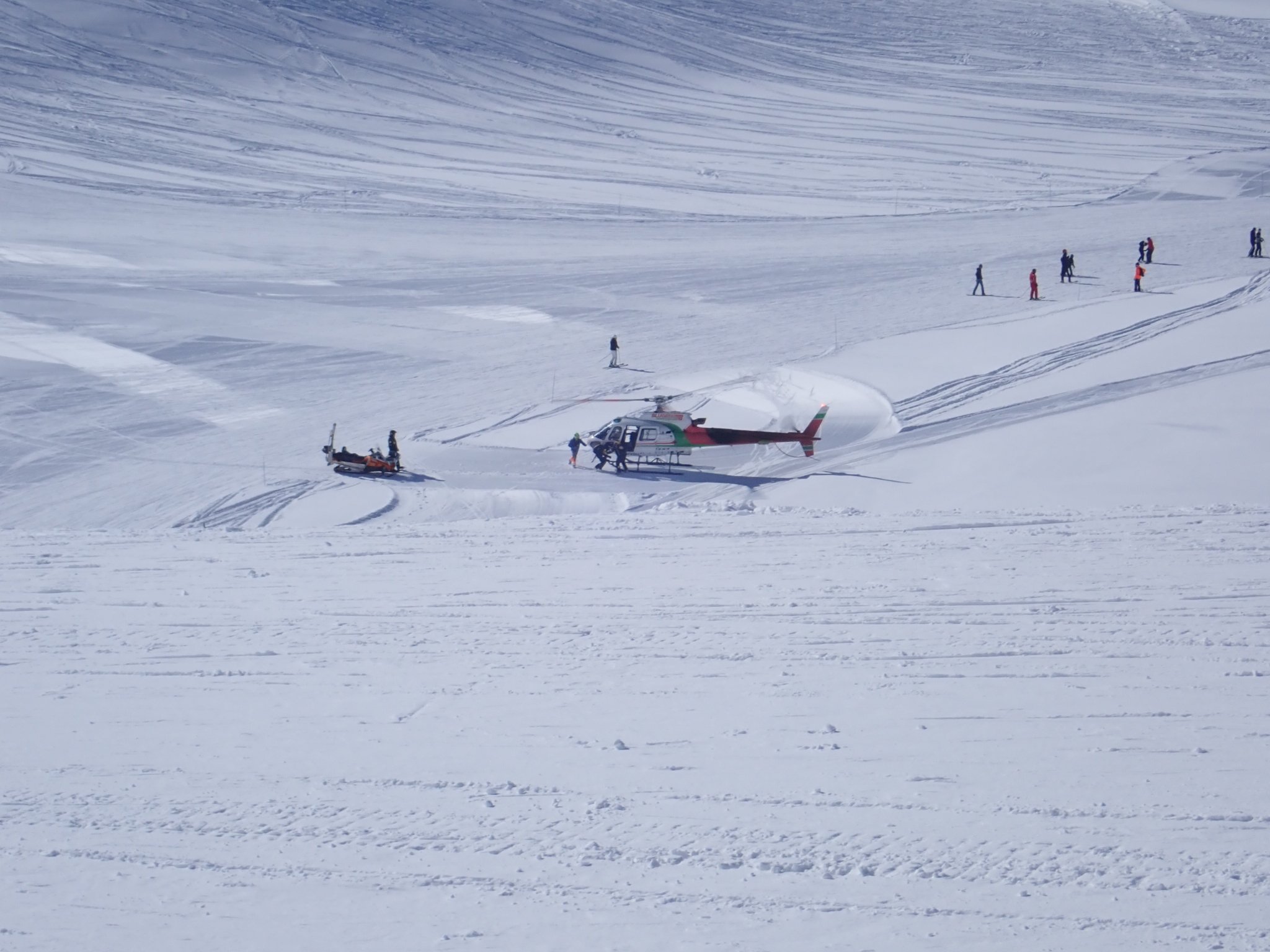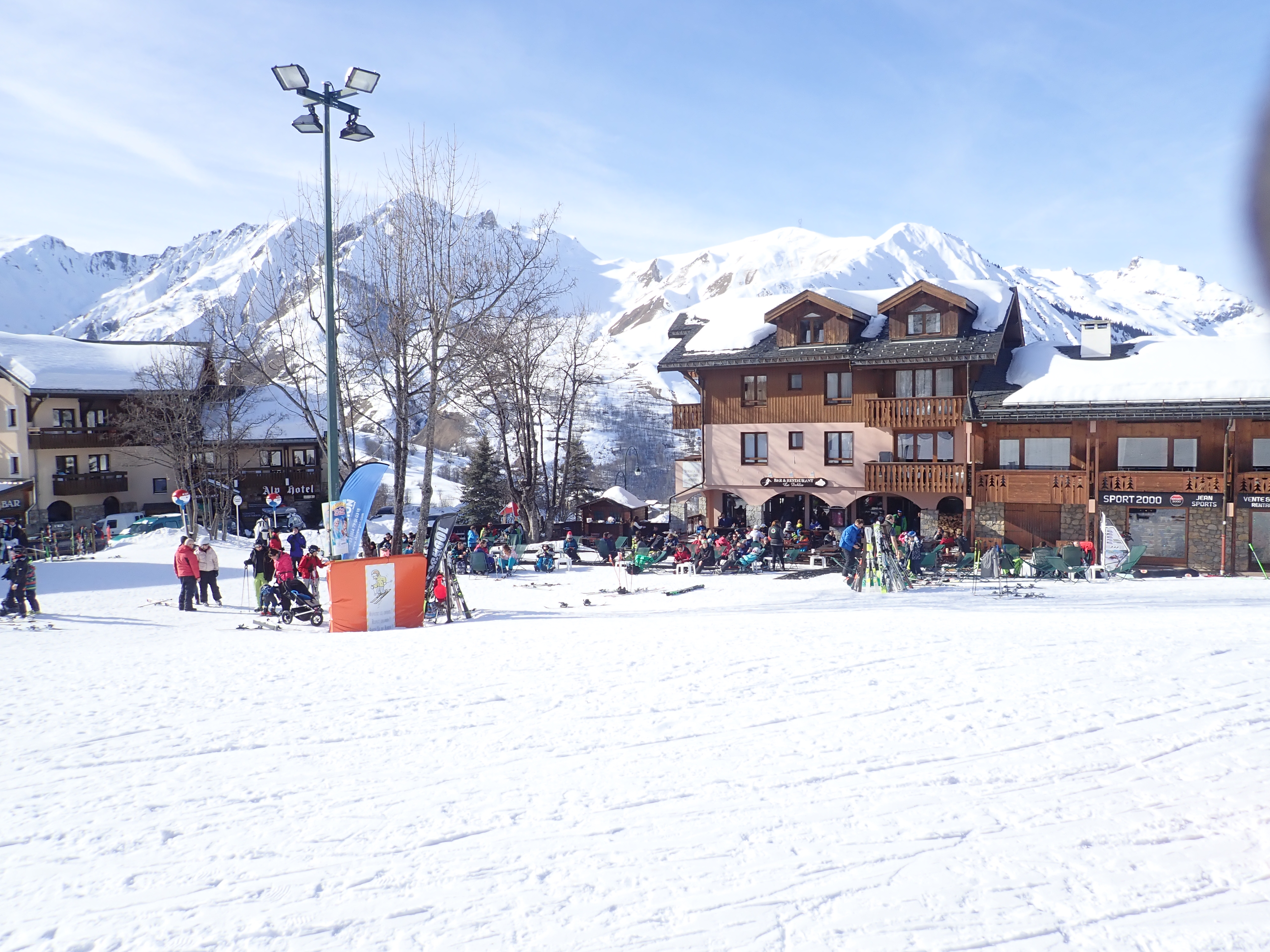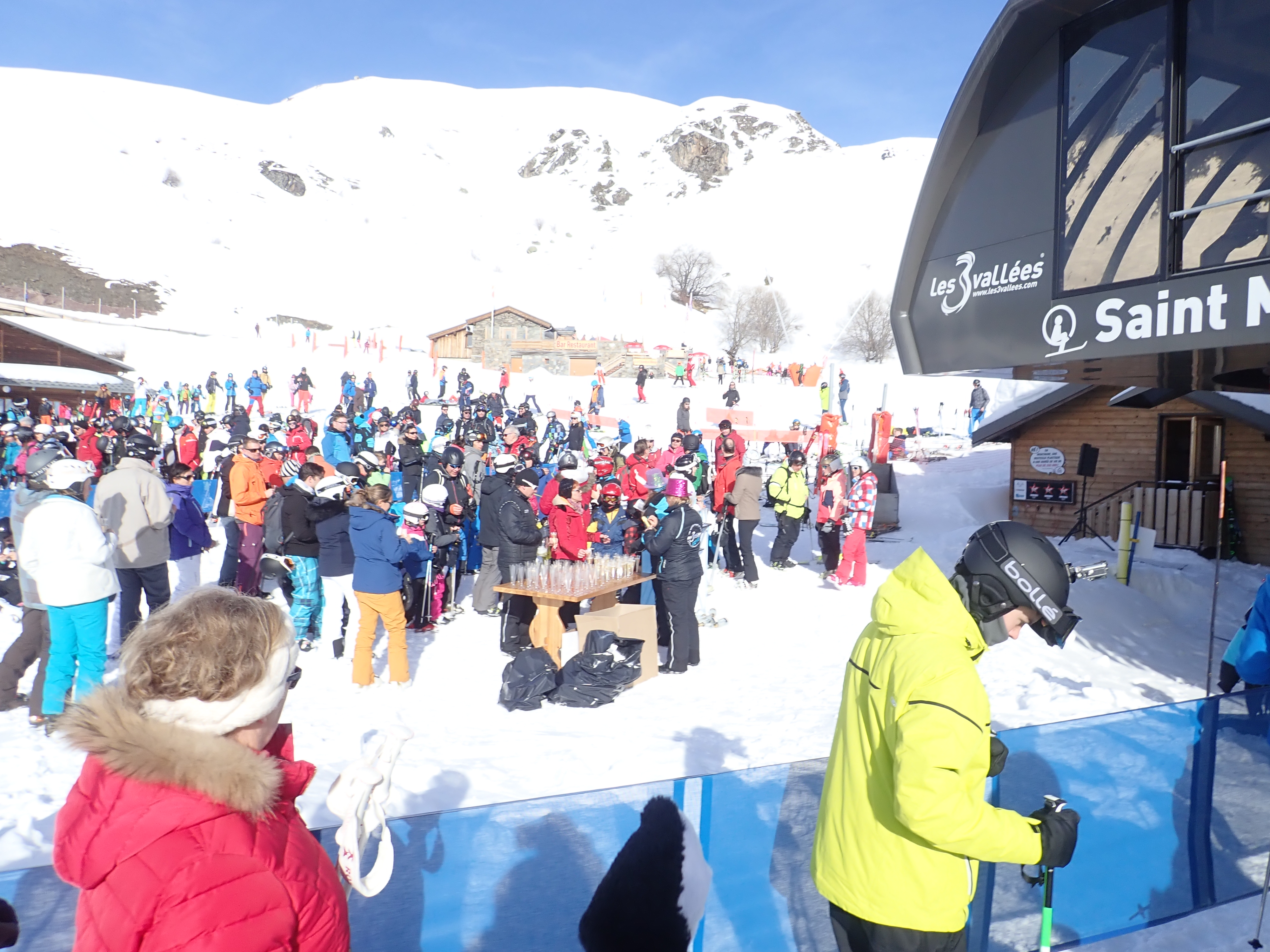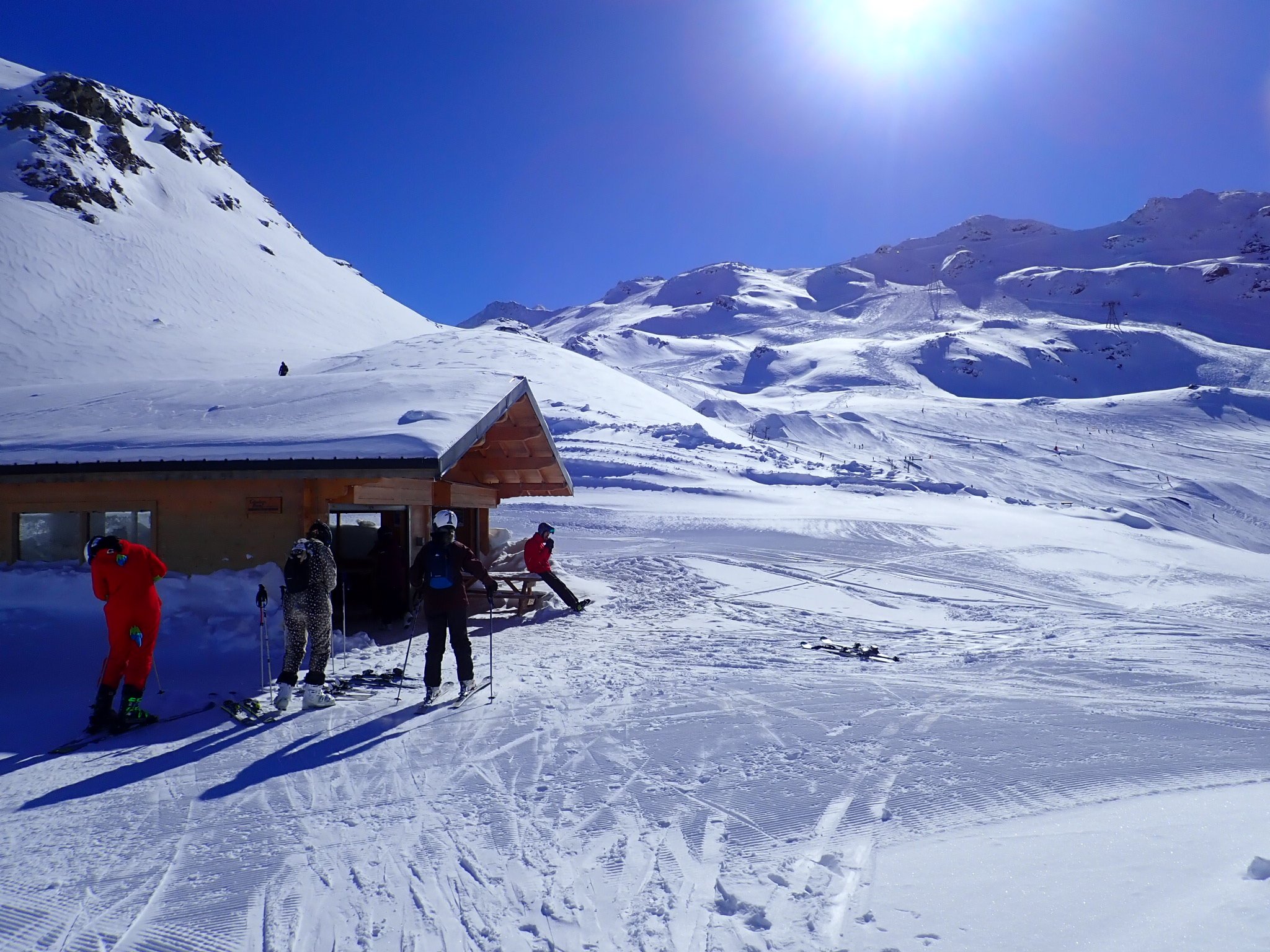 I had wondered how much skiing ability we would have lost on our 5 year gap but it seems surprisingly little. We felt immediately at home on the hard snow that had frozen overnight… I was just thinking how well it was going when I suddenly realised I had no skis on anymore… the first thing to hit to snow at considerable speed was my nose followed by my helmet visor. This will reduce the cost per crash of the helmet I thought as I slid face first down the mountain….. I have no idea what happened, I probably crossed a ski but whatever caused it my nose appeared to hit the inside of my visor so hard that it took a lump of skin out of the bridge. A few tissues and some bad language later we were off again and I’m sure a pichet of the local painkiller will go down well later. The helmet is fine.