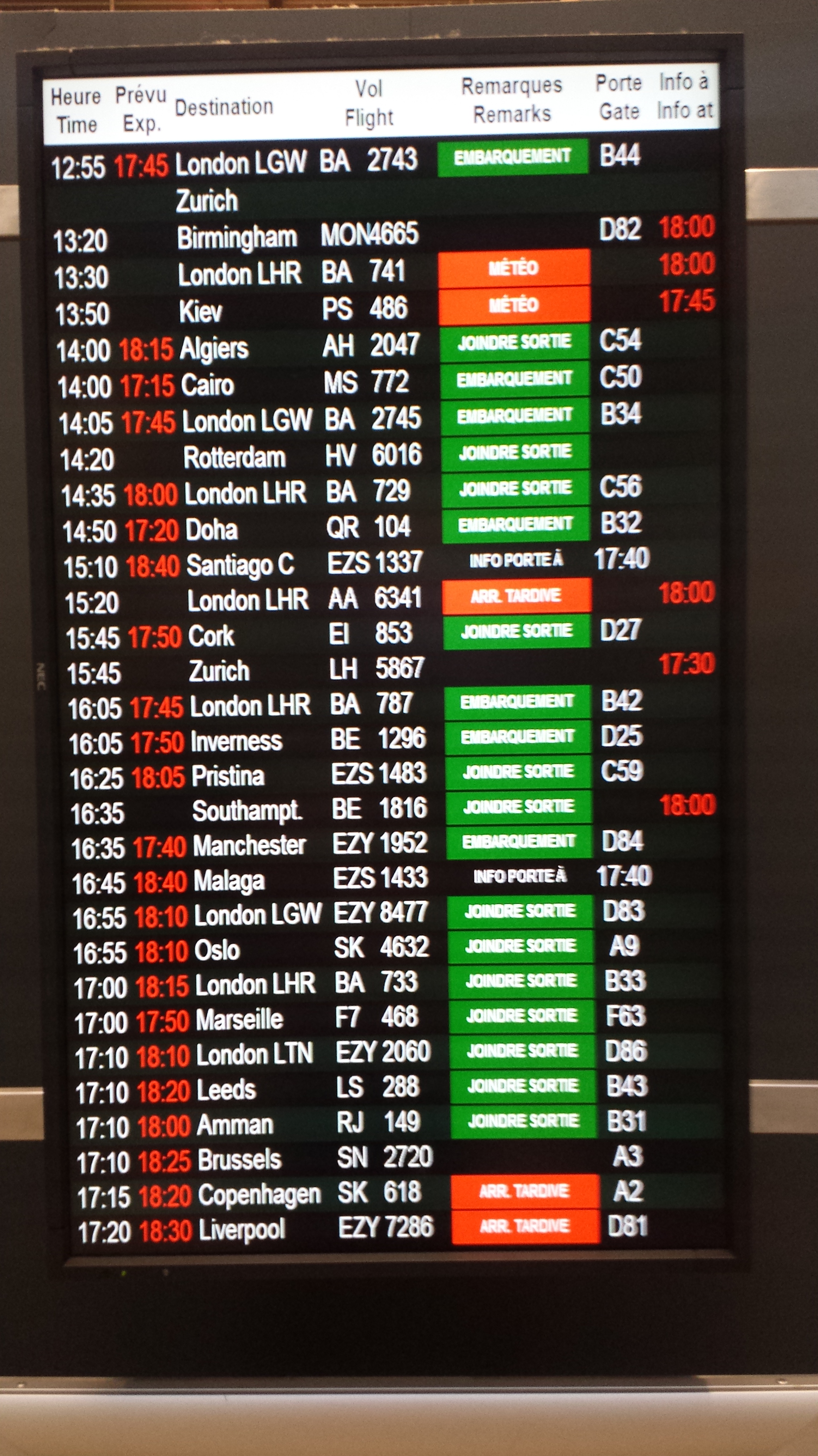 We were finally told to move to another gate, and that we would be leaving at 19:00, that will be 5 1/2 hours late then… We grab our bags, now seriously weighed down with chocolate and head for the new gate, where we wait a bit more. Sure enough a plane arrives, and the passengers (who have been sitting on it for a very long time at Lyon), disembark while we wait expectantly. Then the captain appears…. to explain that he is now out of hours and cannot legally fly the plane so they are cancelling the flight, and will reschedule it for the morning. These things really should not happen, airlines have professionals to deal with this kind of event, and they could have predicted that the pilot was going to run out of hours a long time ago.