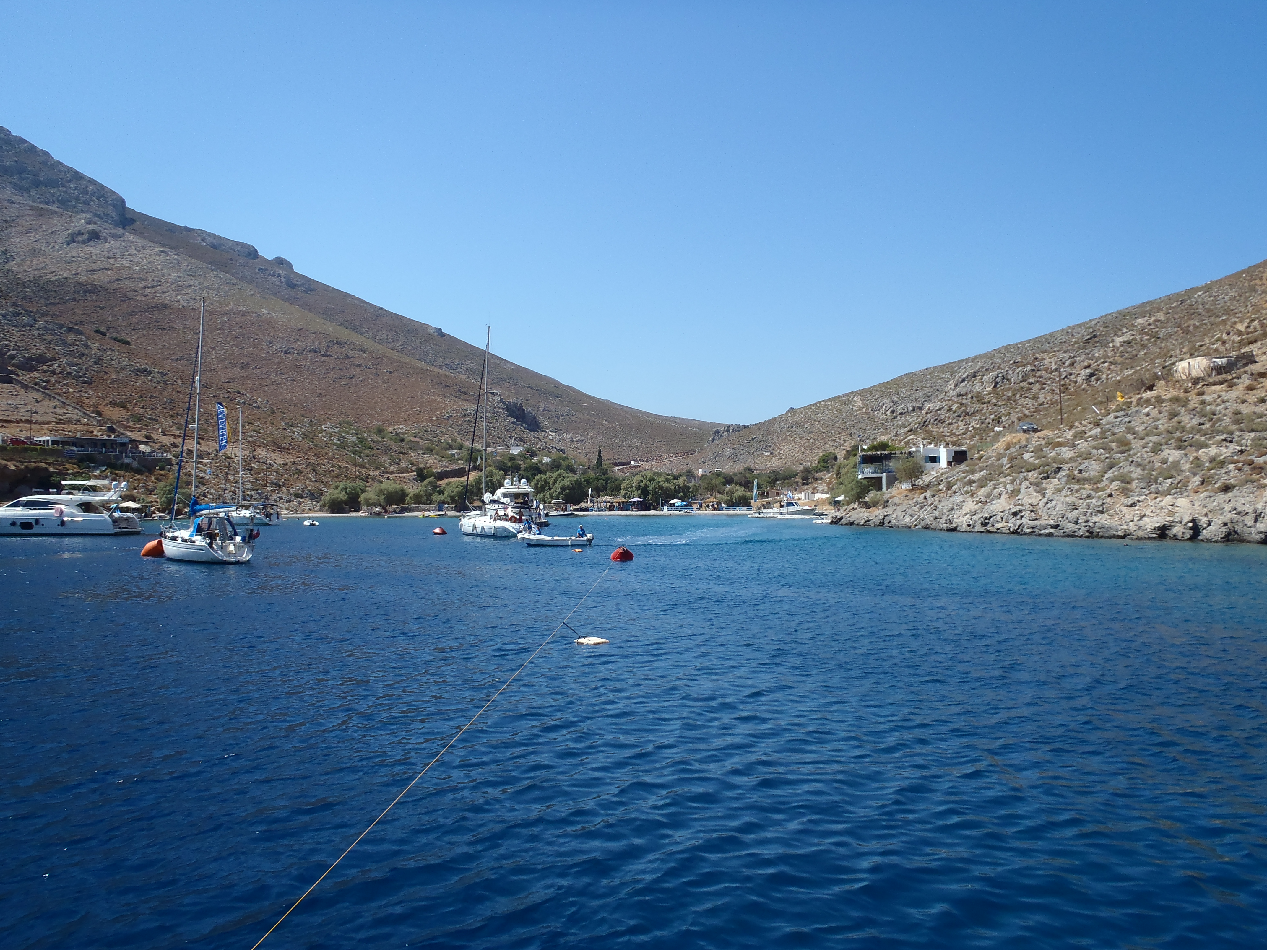 After a quick dip in the bay before breakfast, and a trip in the dinghy to the bakery for some bread for lunch, we sailed south again to meet up with the rest of the flotilla in a bay on the East side of Kalimnos island. It looks almost like a fjord with steep hills all around.