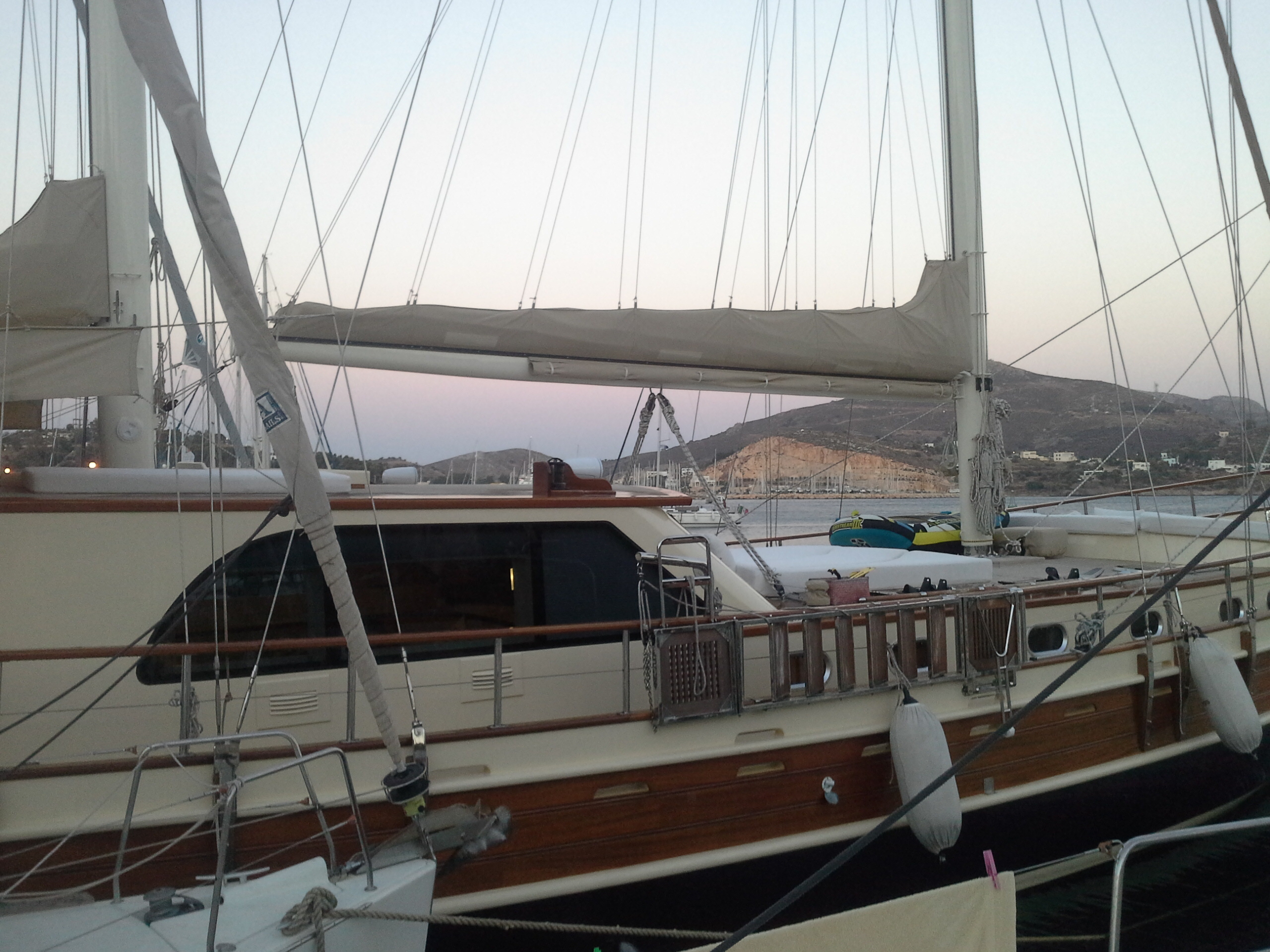 Kos is quite a major base for charter yachts so the marina was pretty busy, we had to queue up to refuel, then radio the marina to find out where to moor up. Happy to tie up without incident and listen to heated arguments in at least 2 languages going on outside over the radio. We have only used 20 litres of diesel the entire week, which not much at all, the boat has at least a 200 litre tank. With such good wind we have only used the engine to get in and out of bays and ports, and occasionally to charge our batteries and chill the beer in the fridge. The boat is pretty self sufficient,  it carries 400 litres or more of fresh water, can store heat from the engine to  heat enough water for 4 showers effortlessly, and we have huge batteries to run our lights and navigation gear. In towns and Marinas we can sometime plug in to shore power, but we have not been able to do that for three nights, so the beer was only just cold…. The super yachts of course have generators, aircon and desalination plants, but they burn 20 litres of diesel in a couple of minutes…..