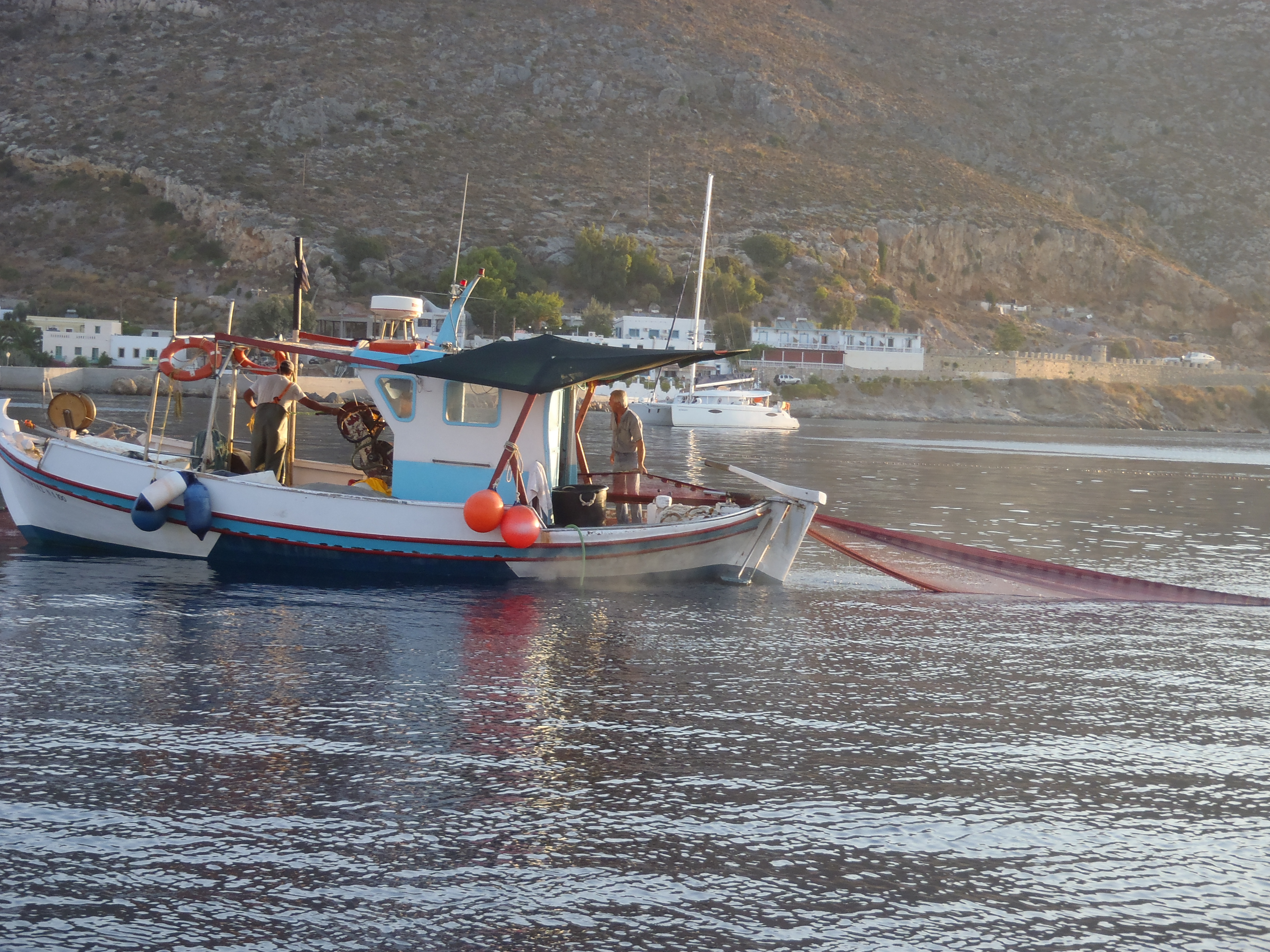 I woke early and so went on deck to check that nothing had moved in the night,  just in time to see a fishing boat fishing between the area we were anchored in and the harbour mouth.  He laid his net in a perfect circle and then came back around to the beginning to collect the other end of the net and put it onto a winch. He then winched it in to close the circle of net and finally bring it aboard with a haul of small fry.