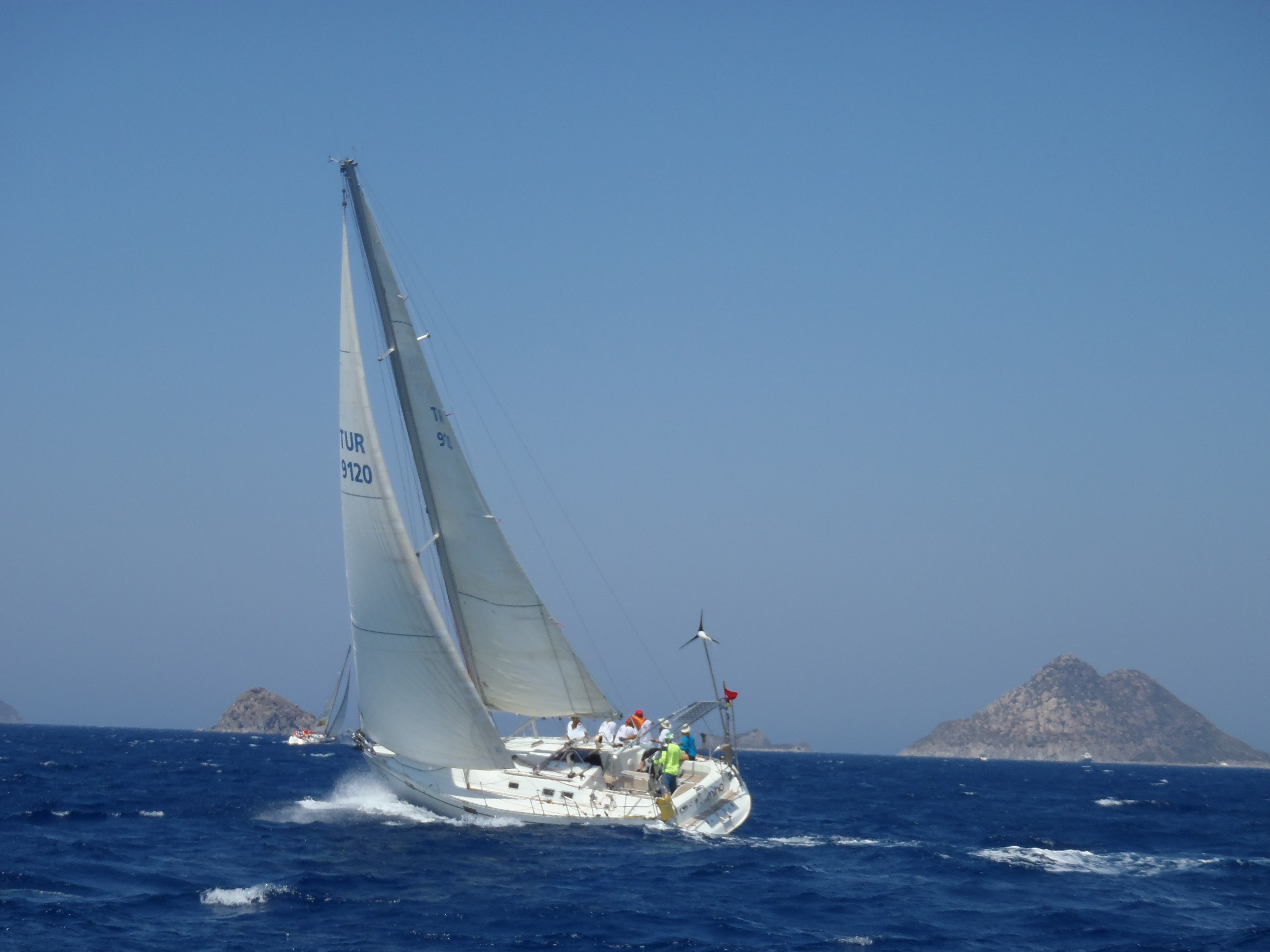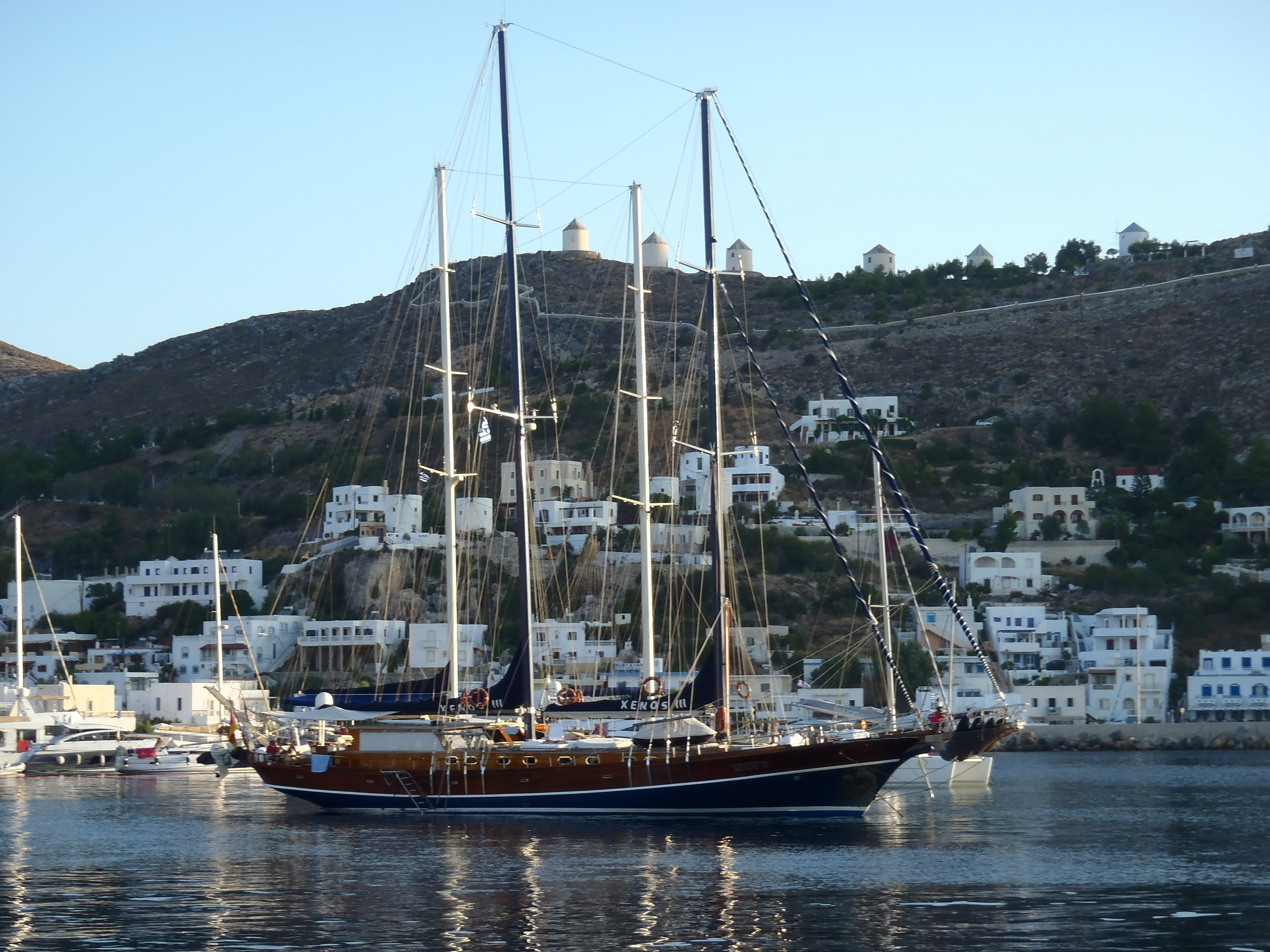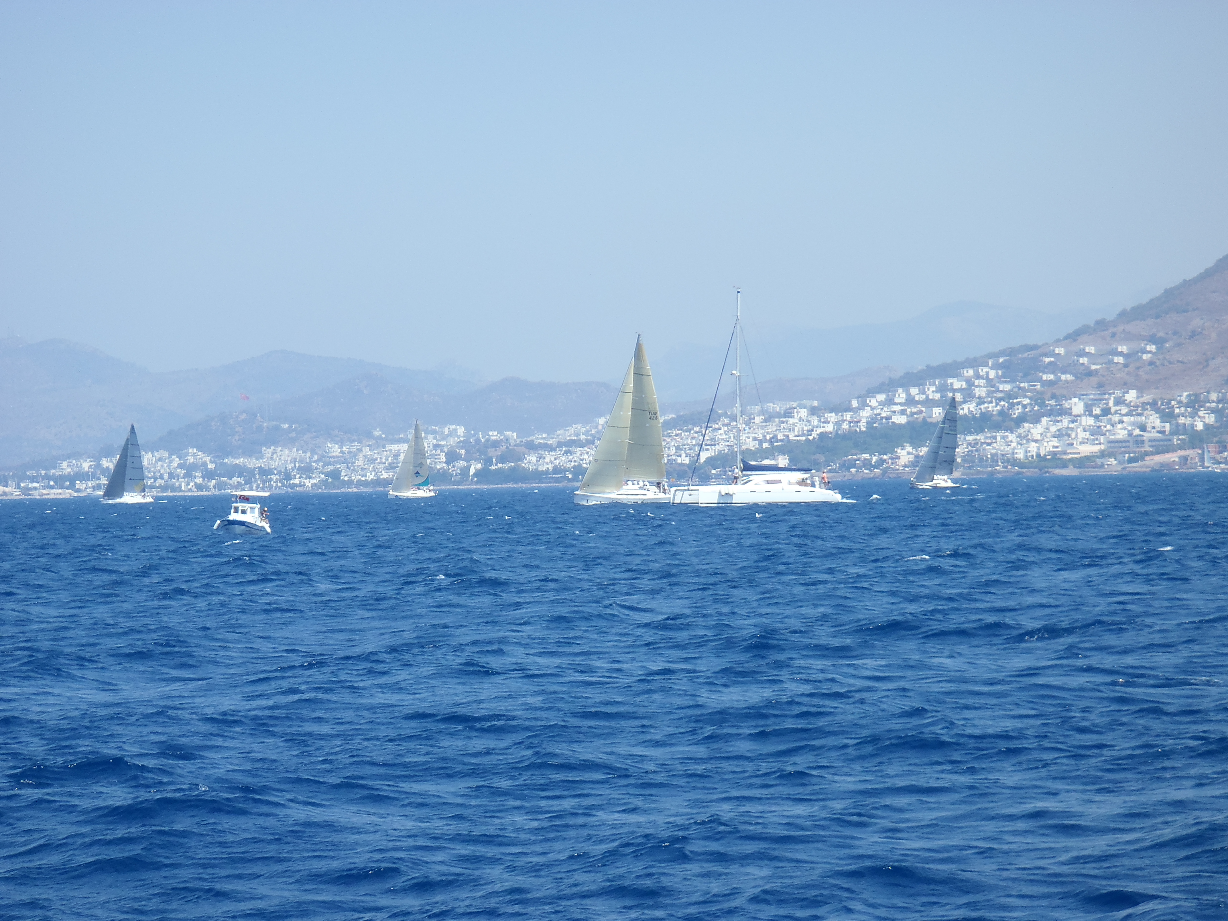 After the usual hassle of stowing the dinghy without dropping to outboard in the sea, we had a fast long run down to Kos, carrying a bit too much sail made the boat hard work to steer in the rolling swell but pushed us along at 8 knots, which is about as fast as a boat this size wants to go. We rounded the corner of Turkey to sail past Bodrum to find ourselves in the middle of a yacht race going the other way.