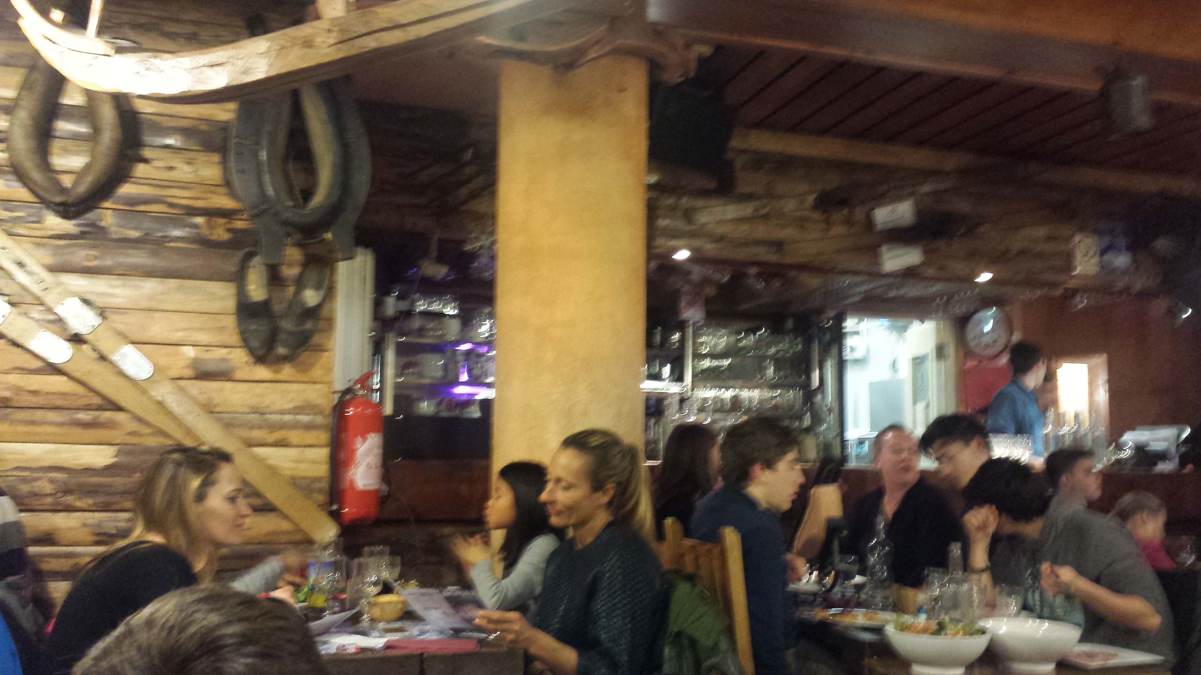 Anyway, skis rented, breakfast and chocolate for eating on chairlifts bought, we retired to a restaurant called the “boule de neige”. Complete with old wooden skis nailed to the wall (the skis are older than the resort, let alone the restaurant)