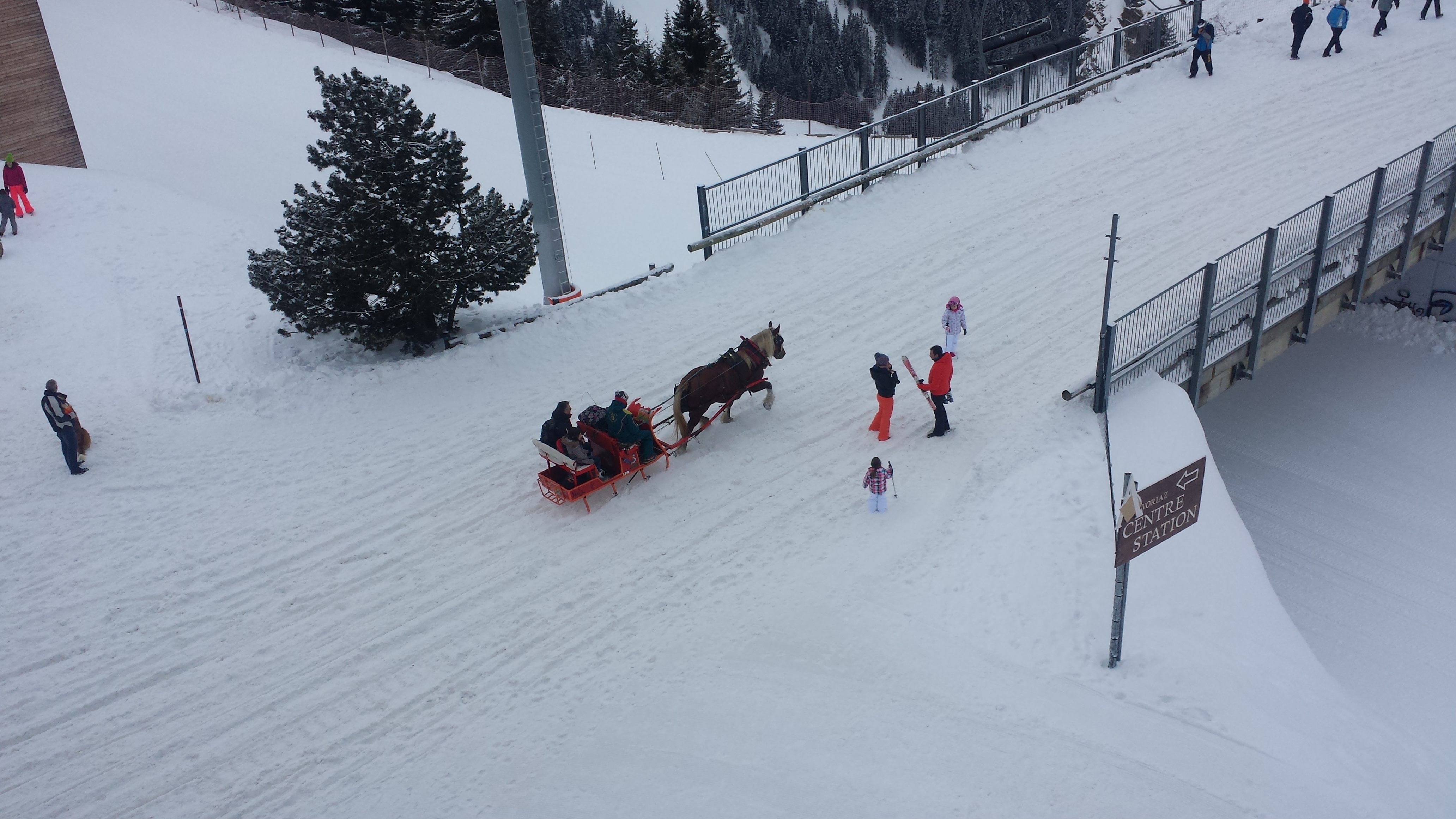 Avoriaz is a car free resort, so the transfer dropped us at a reception area, where according to the brochure, we should be greeted and transferred by a traditional horsedrawn sleigh to our apartment. Of course the reality is a little more “French” than that, and involves a lot of people standing around with no clear indication as to how you actually get anywhere, After 30 minutes or so of not getting anywhere we had a 5 minute sleigh ride, actually pulled by a horse to be fair, to our apartment. It was getting dark and snowing so I am afraid you don’t get a picture of the horse… I’ll try and grab one later in the week.