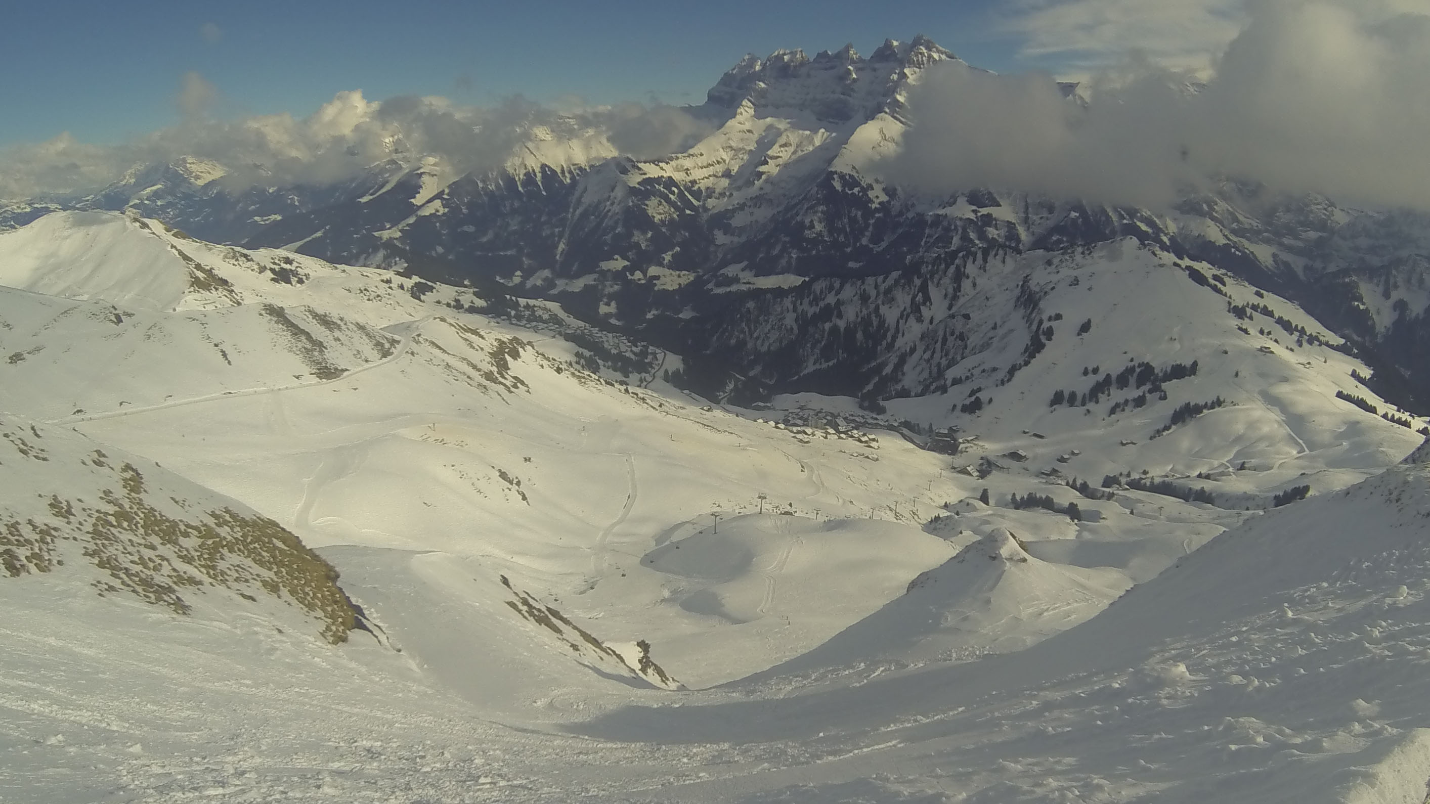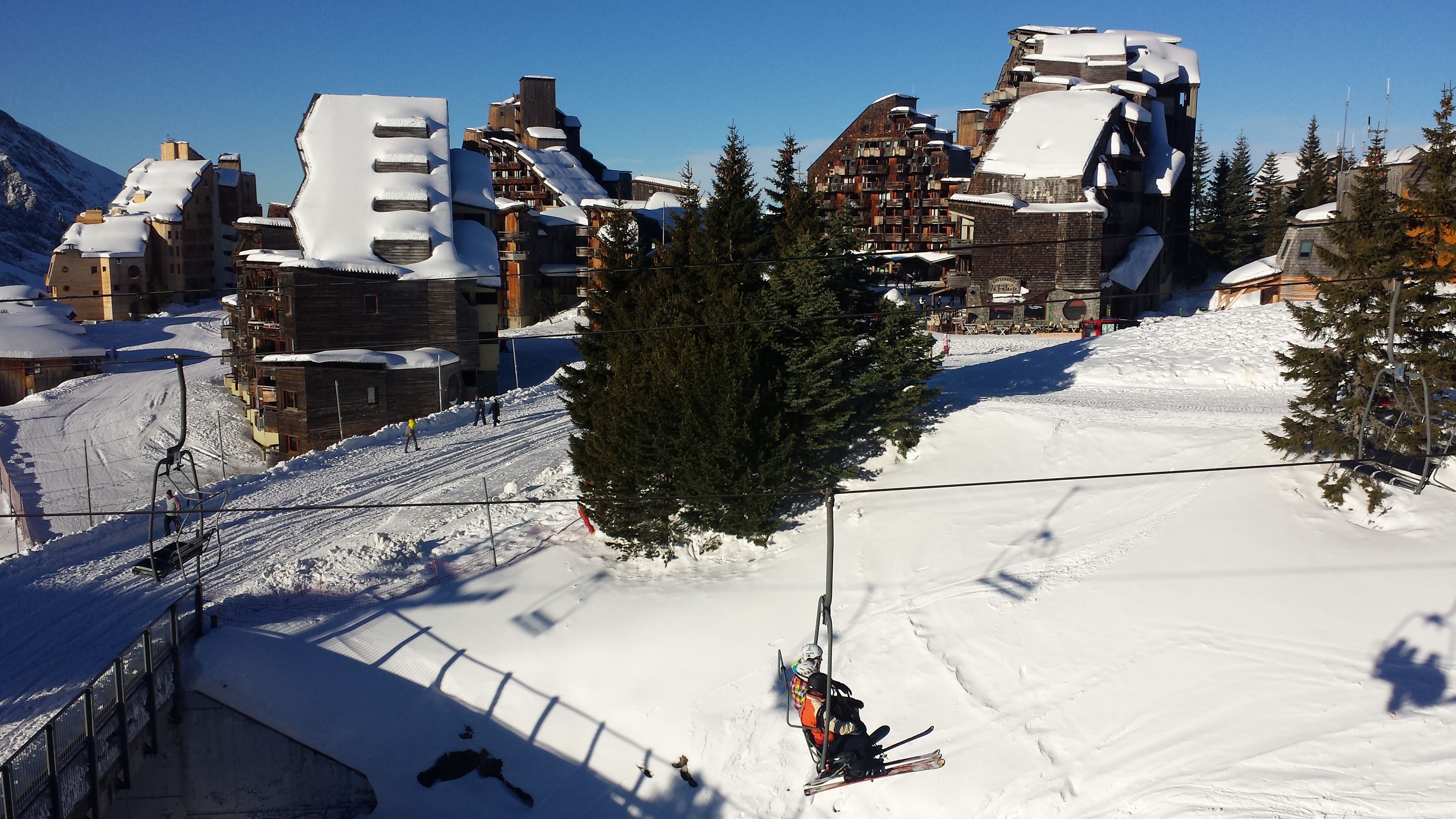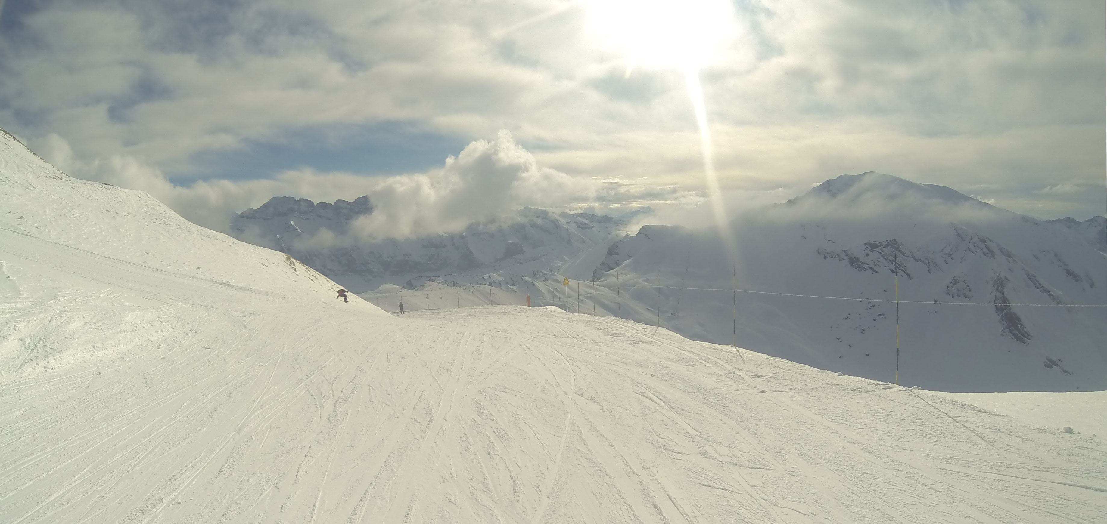 When you consider the architectural train wrecks that were built in the Alps in the 70s and 80s you have to give whoever designed this one a bit of credit really don’t you? The steel lift tower on the right of the picture is not bent by the way, that is the wide angle lens on my GoPro helmet mounted camera. The idea today was to have it set to take a picture once a minute, this means I have a small number of pictures of the view, and a lot of the buckles of my rucksack, my gloves, the back of someone else’s head in a lift queue… But it kind of works. Here you can see a great field of Moguls under a lift. They are a bit obsessed with Moguls around here, I hate the things give me steep but smooth any day…